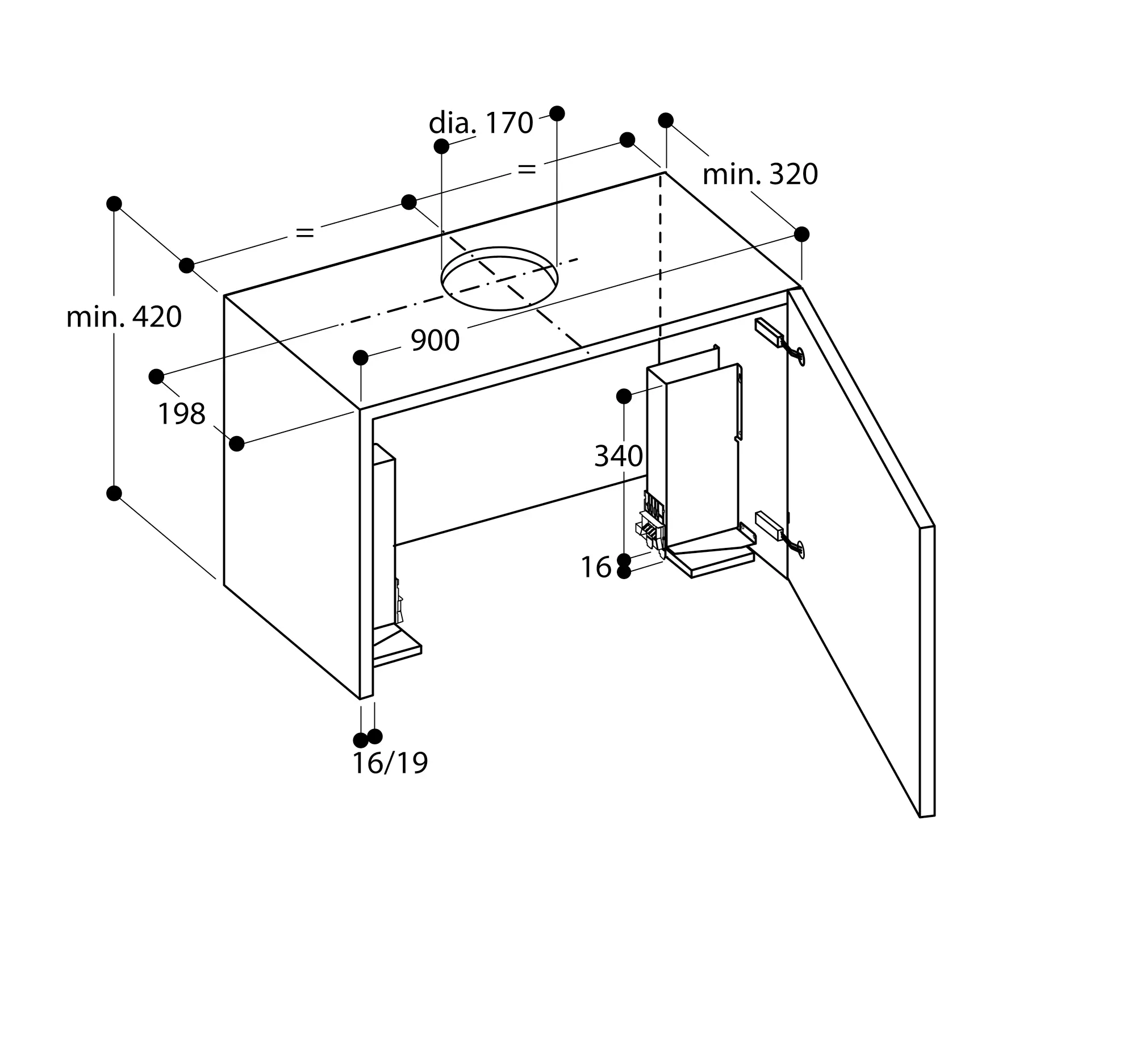 The required cavity height of the upper cabinet together with the lowering frame measures 600 mm.