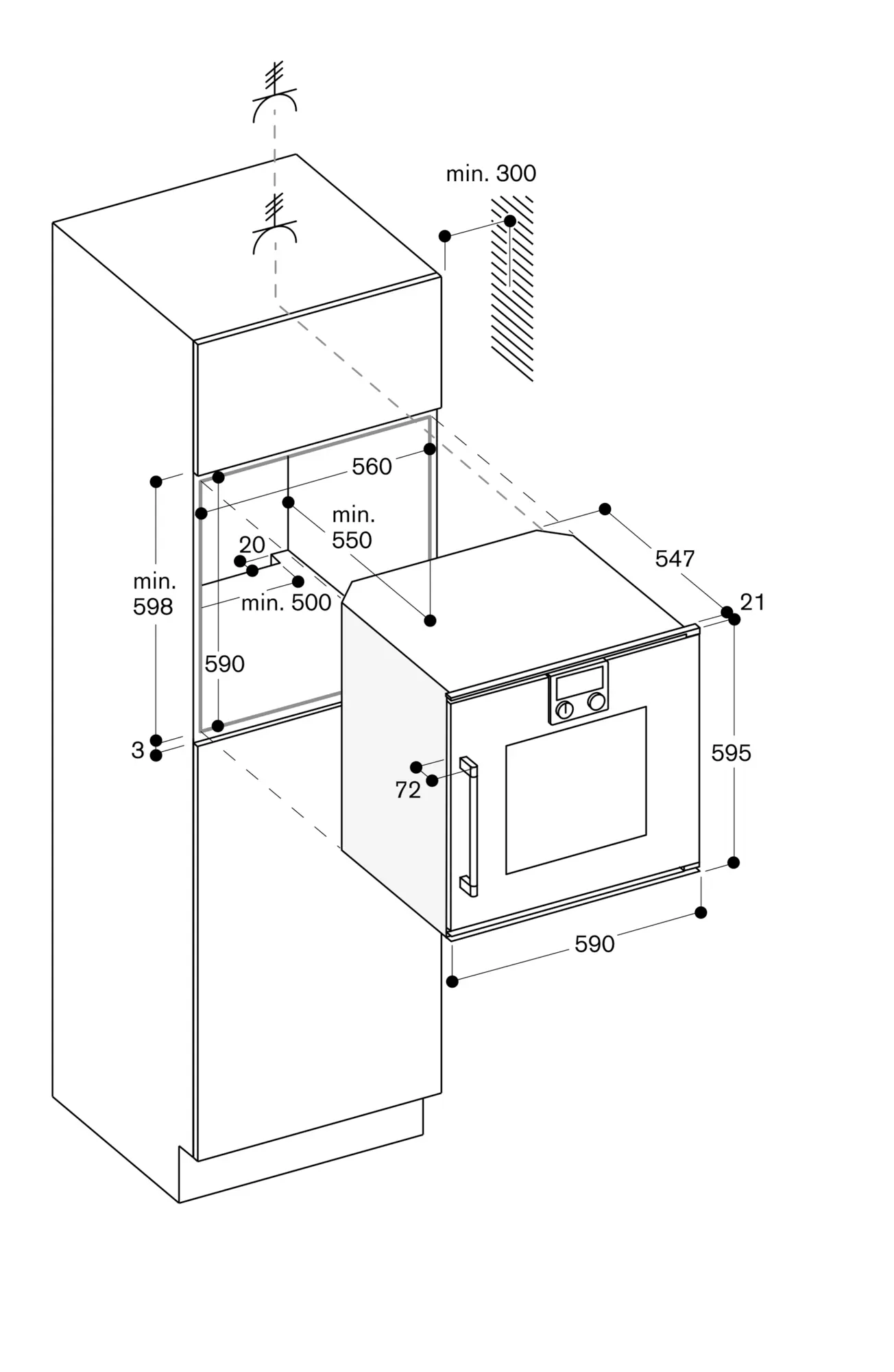 For installation underneath cooktops: Distance between the underside of the cooktop and the top edge of the oven cavity: min. 15 mm. The planning notes for the cooktops (particularly regarding ventilation, gas/electric connection) must be taken into account.