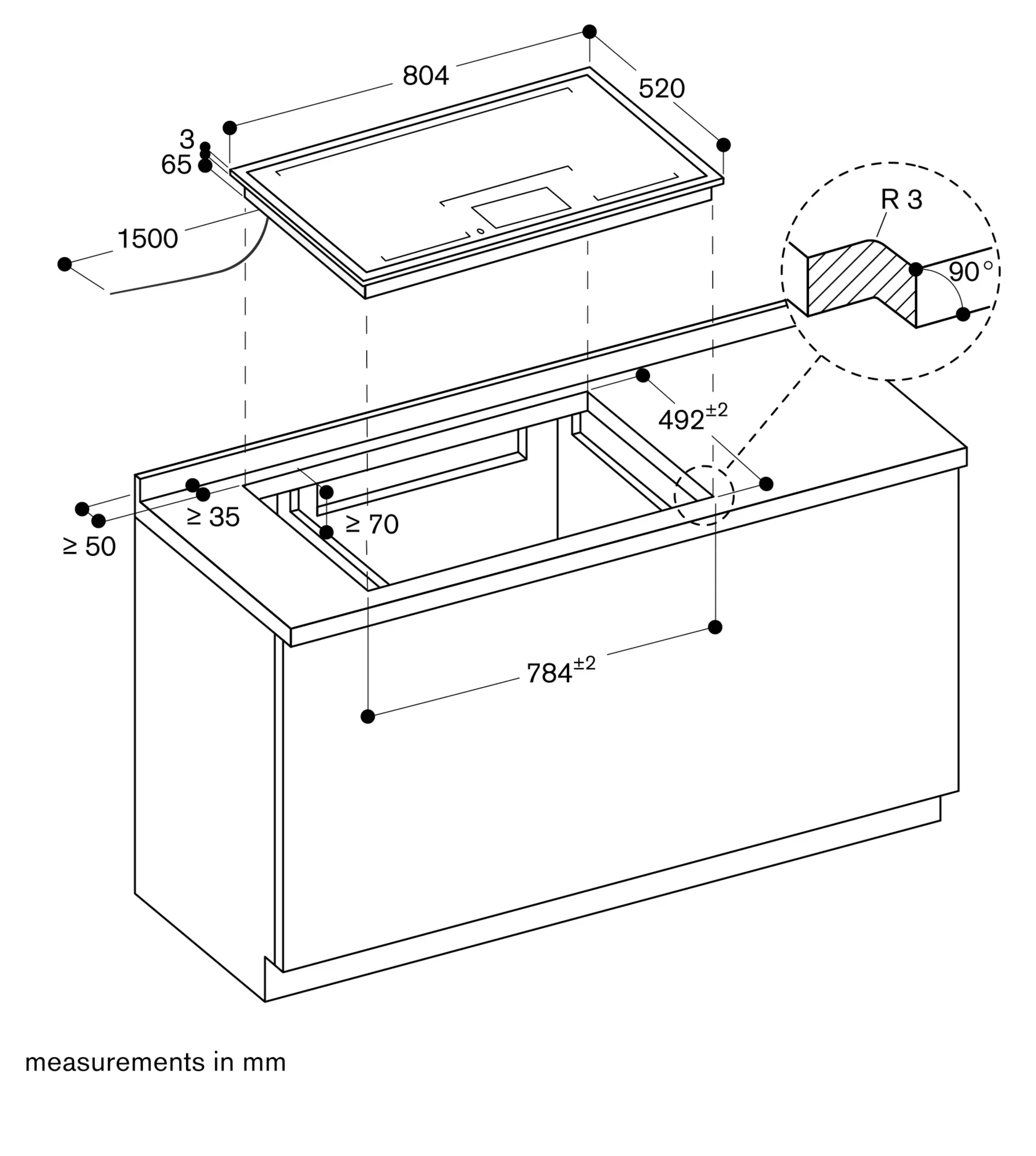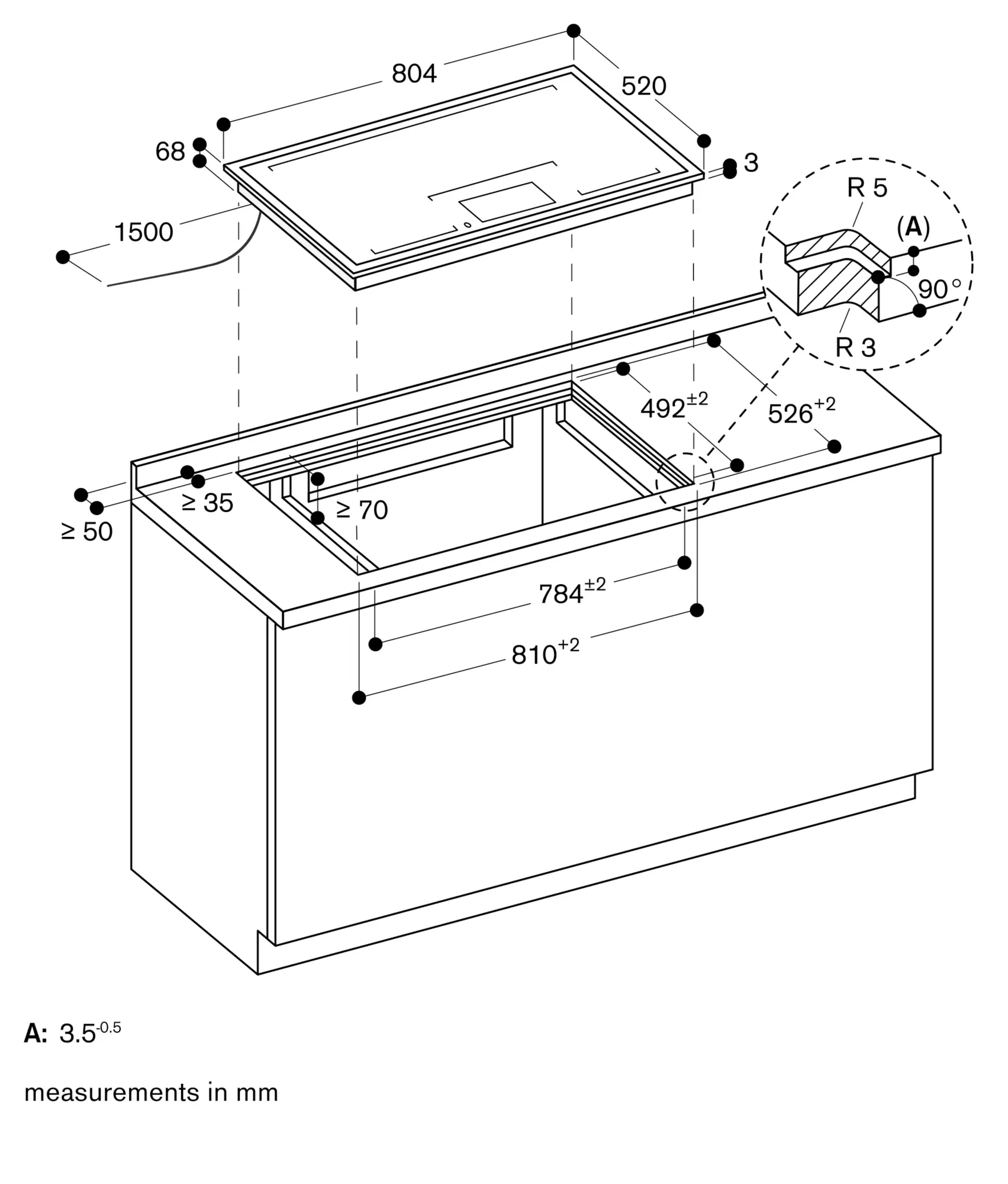 Installation is possible in worktops made of stone, synthetics or solid wood. Heat resistance and watertight sealing of the cut edges must be observed. Concerning other materials please consult the worktop manufacturer.