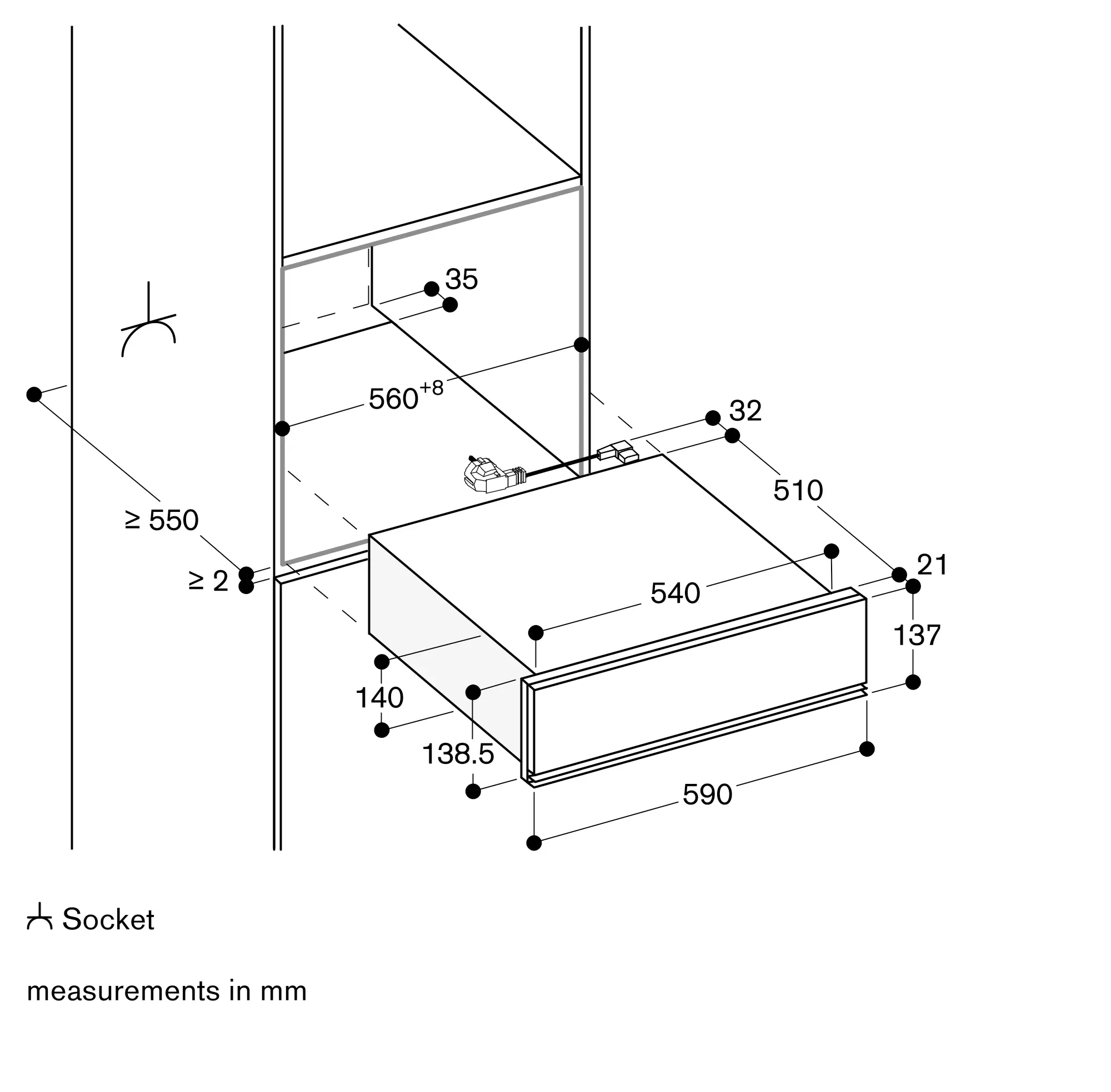 The panel surface of the appliance extends 21 mm from the furniture cavity.