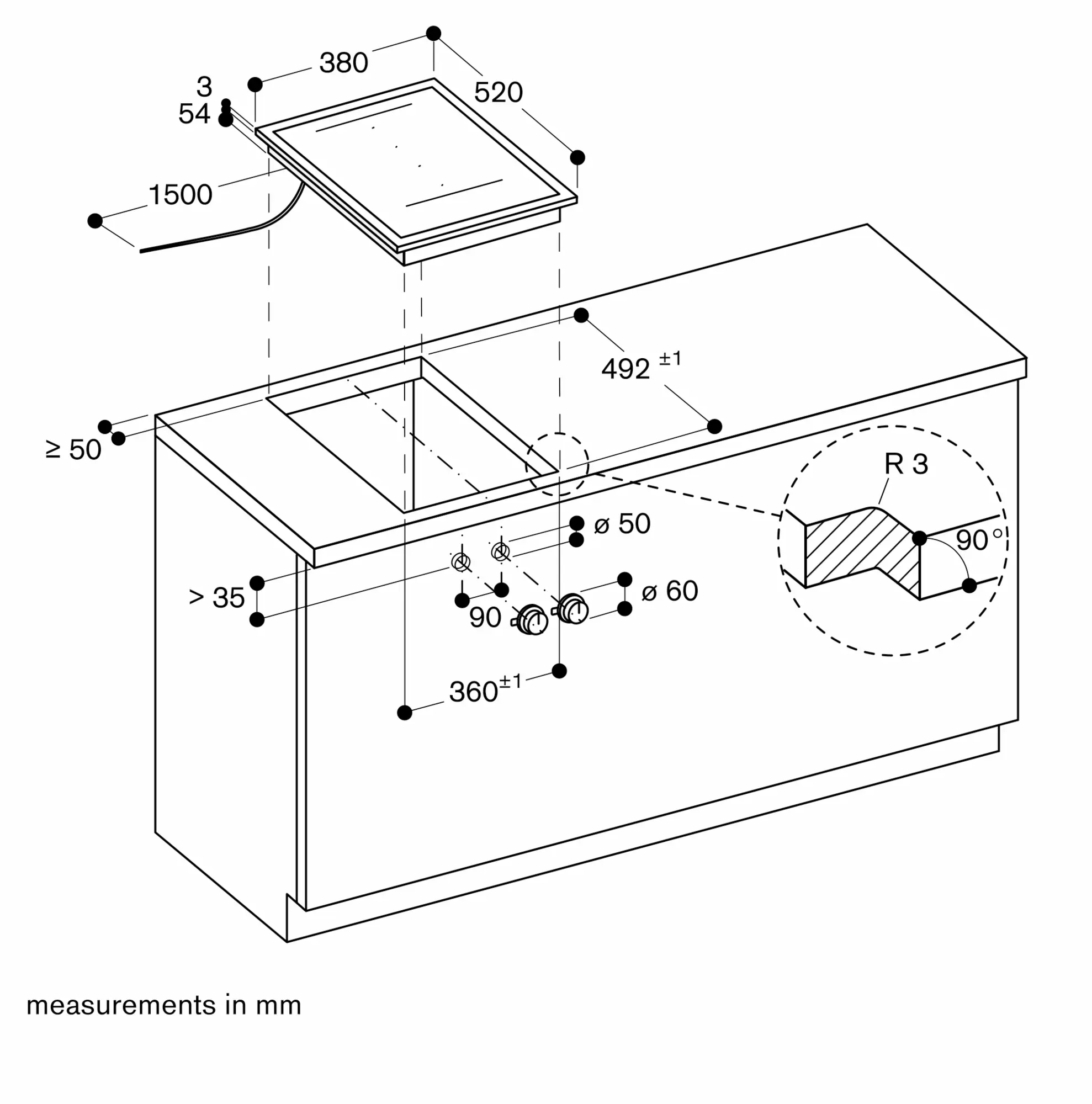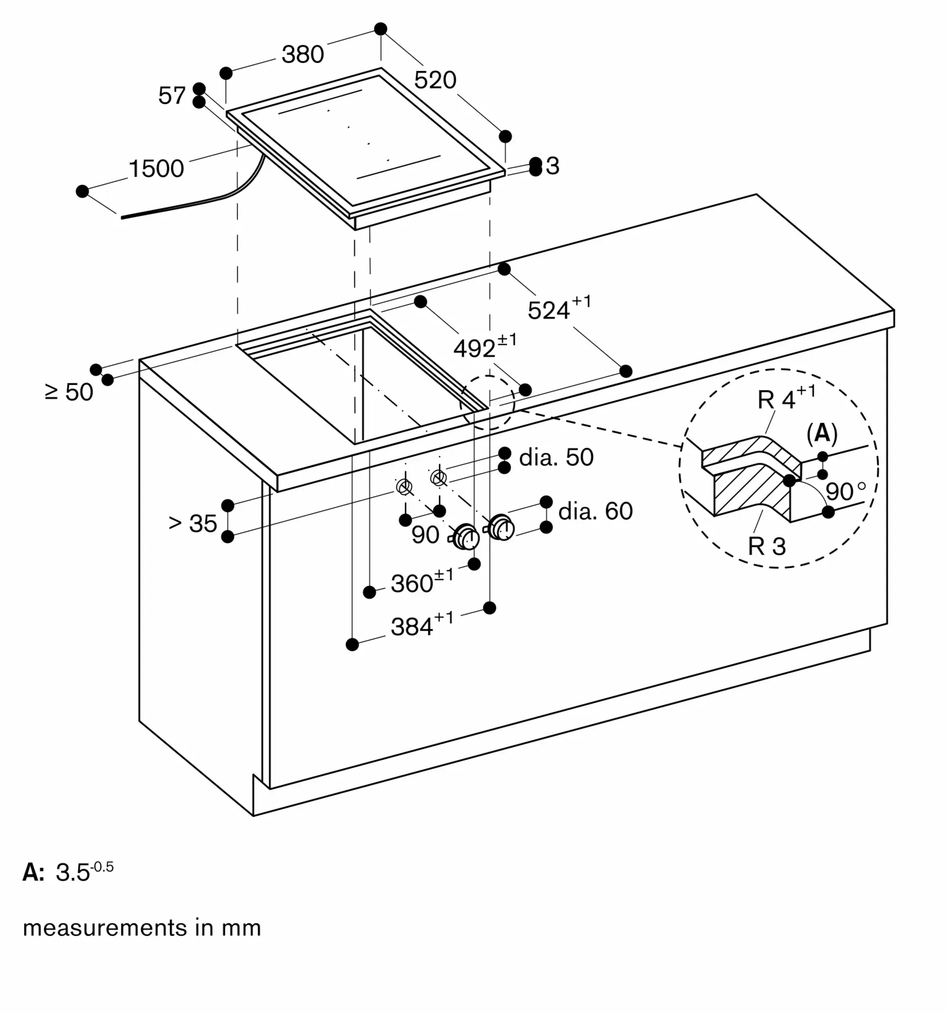 Installation is possible in worktops made of stone, synthetics or solid wood. Heat resistance and watertight sealing of the cut edges must be observed. Concerning other materials please consult the worktop manufacturer.