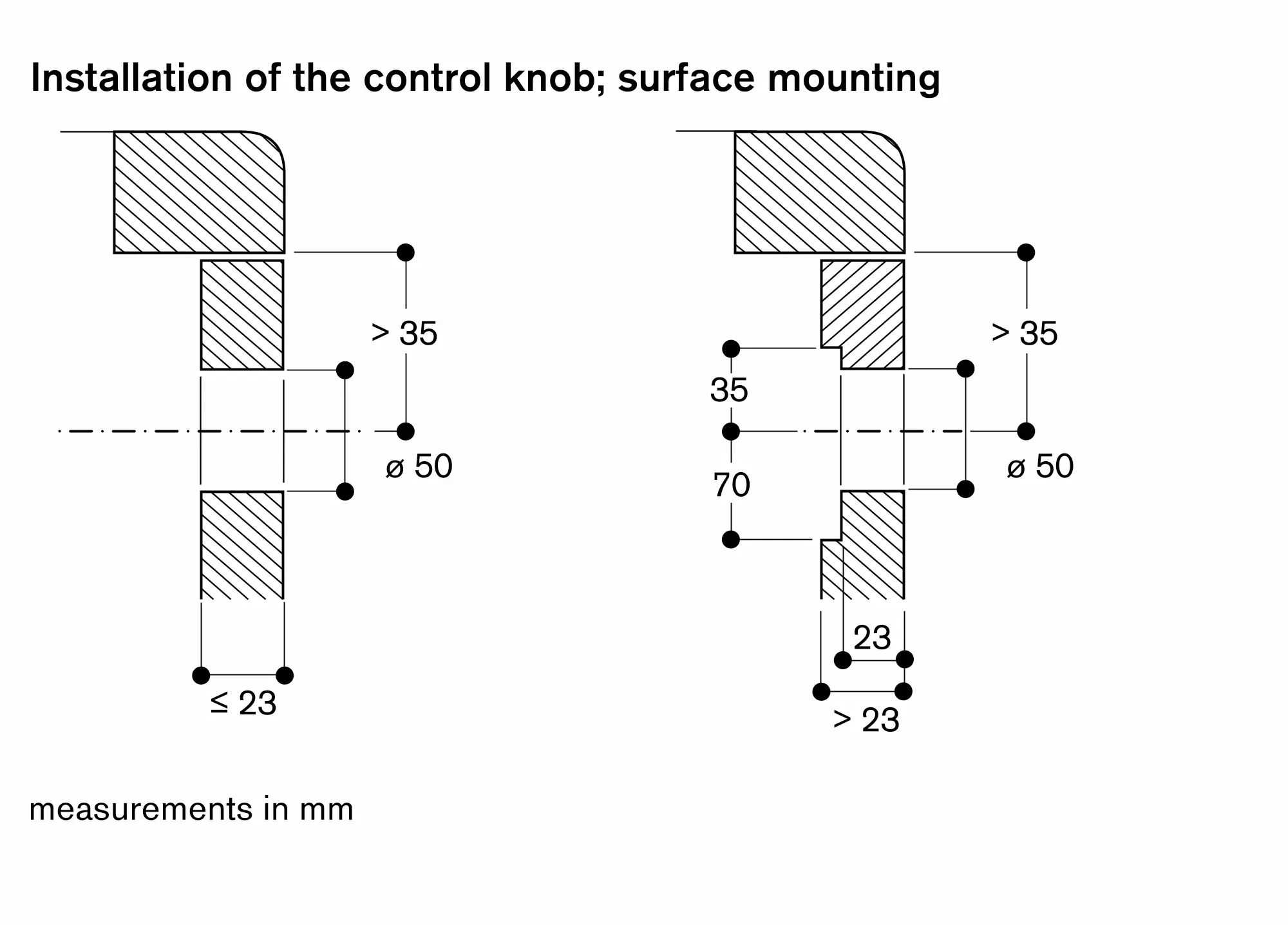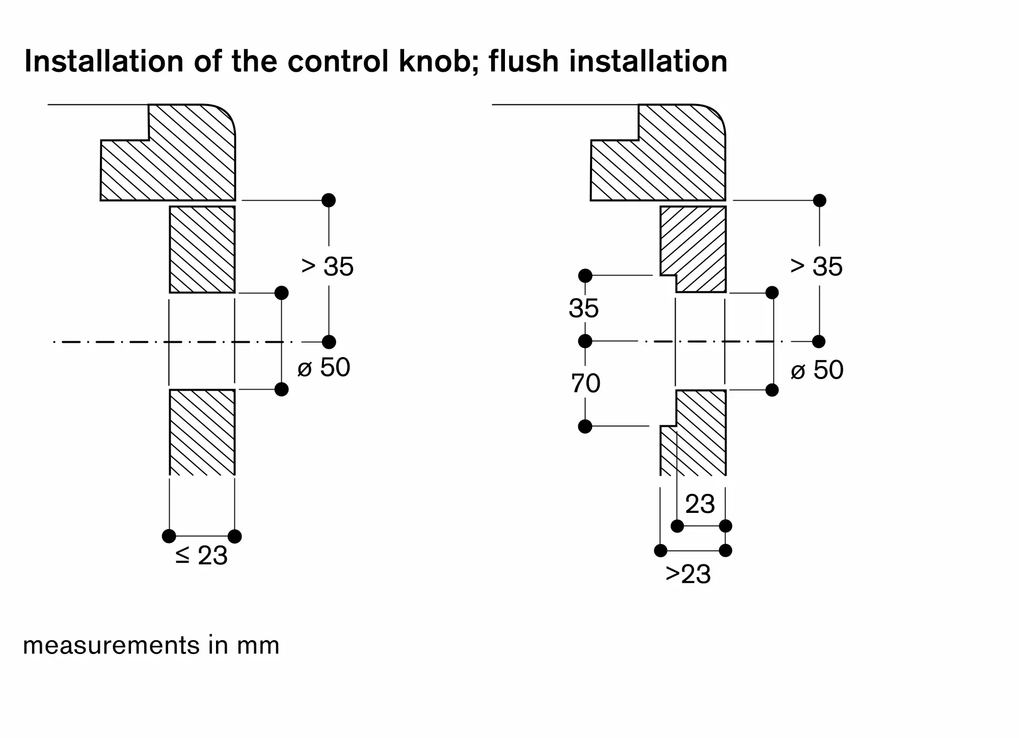 The drawing "Installation of the control knob" must be observed if the panel is more than 23 mm thick (there must be a recess at the rear).