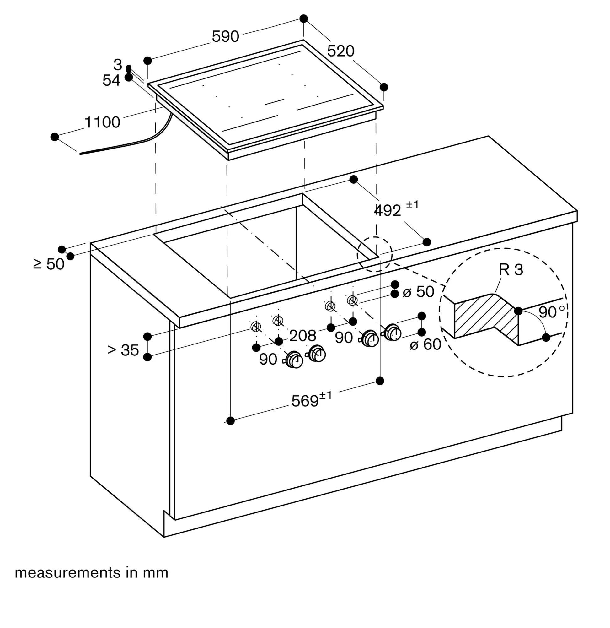 Installation is possible in worktops made of stone, synthetics or solid wood. Heat resistance and watertight sealing of the cut edges must be observed. Concerning other materials please consult the worktop manufacturer.